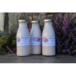 Yaourt fermier à boire fabriqué à la ferme Schumer-Widart à Bizory. Yaourt aux fruits contenant 5% de sucre. En bouteille en verre, caution 0.50€/pièce